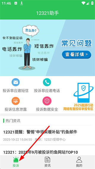 1、進入投訴界面,可看到常見問題解決入口,以及投訴非應邀短信、電話,投訴信息泄露、數據安全等功能,還可瀏覽熱門資訊了解網絡安全提醒。