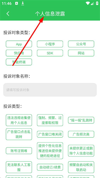 3、個人信息泄露投訴界面,可選擇投訴對象類型,如App、小程序、公眾號等,填寫投訴對象名稱和投訴類型,如違法違規收集使用個人信息等。