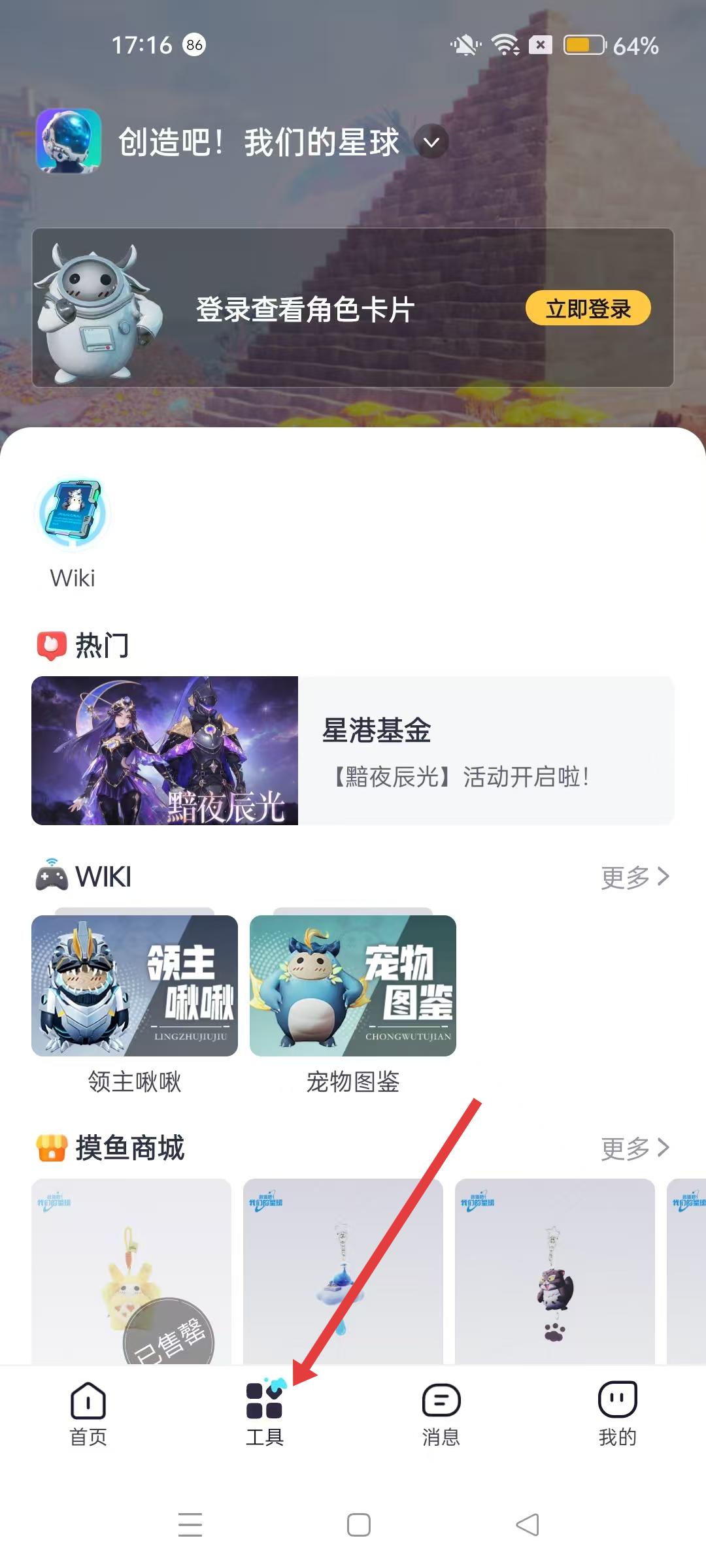 4、點擊工具,可查看Wiki、熱門活動、摸魚商城等板塊,獲取游戲攻略、參與活動、選購周邊,助力游戲體驗。