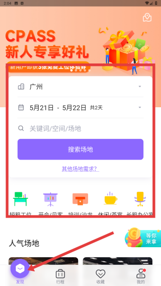 1、cpass手機版APP發現頁面,新人有專享好禮,可搜索場地,涵蓋短租工位等多種類型,還有人氣場地推薦。