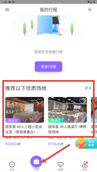 2、APP行程頁面,登錄后可查看行程,推薦優質場地如會議室等展示價格和場地類型。