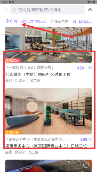 3、APP場地搜索結果頁,定位廣州,篩選5月21日場地,展示時租、日租工位,含價格、地點等信息。
