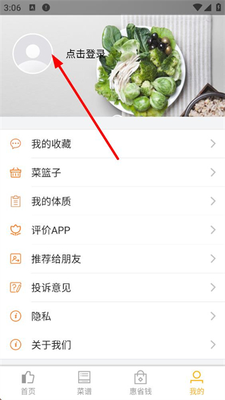 2、個人中心頁面能看到點擊登錄按鈕,下方有我的收藏菜籃子我的體質等功能選項,可進行相關個人功能的操作。