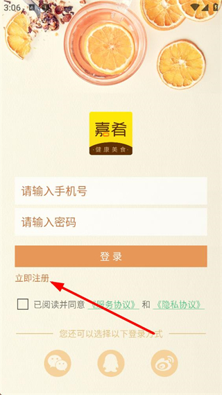 3、點擊登錄后進入登錄界面,能看到嘉肴標識及請輸入手機號請輸入密碼的輸入框,還有立即注冊選項和其他登錄方式。