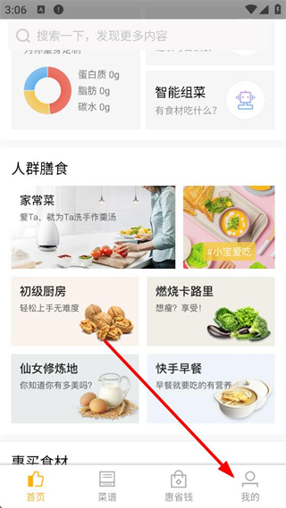 1、進入應用首頁可看到搜索欄和智能組菜等功能,還有人群膳食分類如家常菜初級廚房等,點擊底部我的可進入個人中心頁面。