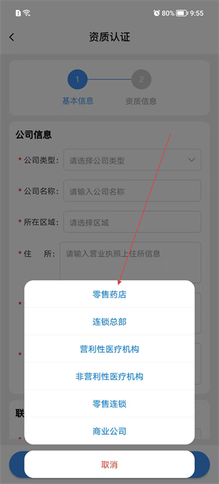 1、企業入駐時先在類型選擇頁挑選零售藥店、連鎖總部等對應企業類型,按提示選好后點擊下一步,規避因類型錯選導致審核駁回,規范流程保障入駐順暢。