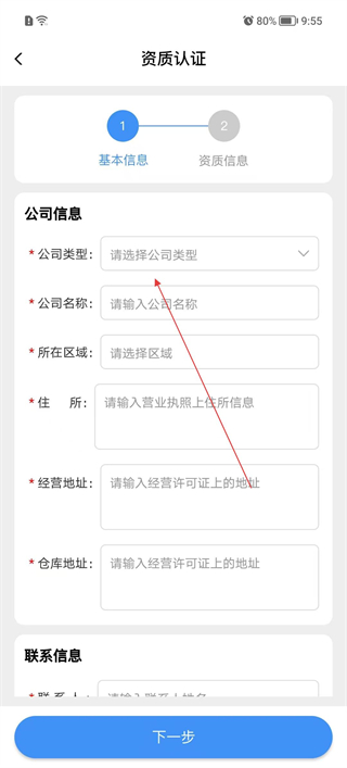 2、進入資質認證的基本信息頁面,選擇公司類型填寫公司名稱所在區域住所等信息,準備完善公司相關資料。