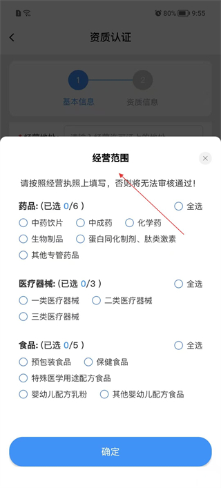 3、在資質認證流程中選擇經營范圍,按照營業執照信息勾選藥品醫療器械食品等對應類別,確認后點擊確定按鈕。