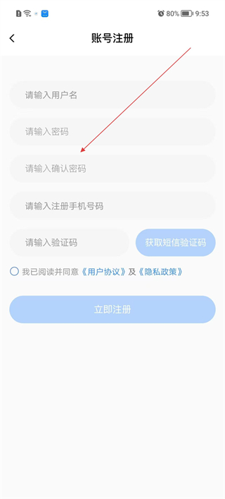 1、打開軟件進入賬號注冊頁面,依次輸入用戶名密碼確認密碼注冊手機號碼,獲取并填寫驗證碼,勾選協議后點擊立即注冊完成賬號注冊。