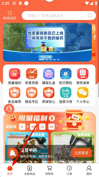 1、進入首頁可看到物流掃碼、搜索框,獨家新品推廣,限量福利、參茸貴細等功能入口,還有限量福利活動及商品推薦板塊。