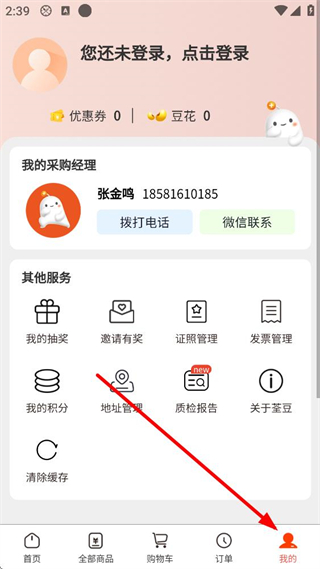 2、點擊底部我的選項,進入個人中心,可查看優惠券、豆花數量,聯系采購經理,使用我的抽獎、邀請有獎等服務,管理證照、發票、積分、地址等。