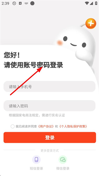4、進入賬號密碼登錄界面,輸入手機號、密碼,同意用戶協議和個人隱私保護政策后即可登錄,也可選擇短信登錄或微信第三方登錄方式。