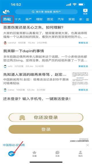 1、進入熱帖版塊看各類熱門討論,涵蓋家庭生活等主題,每條內容顯回復數與點贊數,登錄后可參與互動。
