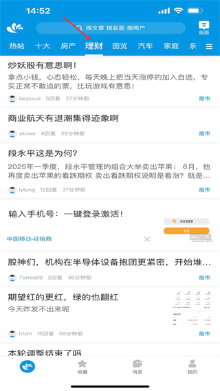 3、進入理財版塊,查看股市投資等相關討論,涵蓋個股分析、行業動態等內容,助力了解理財信息。