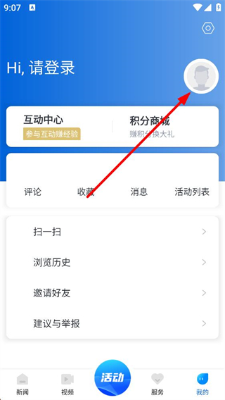 2、點擊底部我的按鈕進入個人頁面,能看到登錄提示,還有互動中心積分商城等板塊,以及評論收藏等功能選項和掃一掃等操作入口。