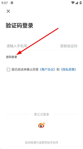 4、切換到密碼登錄界面后,依次輸入手機號和密碼,勾選同意用戶協議和隱私政策,之后點擊登錄按鈕,即可完成賬號登錄操作進入個人中心。