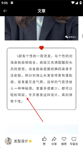 3、閱讀文章內容了解發型設計細節,比如個性劉海搭配挑染等手法,還能對喜歡的文章進行贊分享推薦等操作,與其他用戶互動交流美發心得。