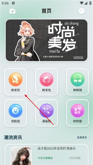 1、打開軟件進入首頁,可點擊換發型按鈕嘗試不同發型,也能選擇換發色換眼鏡等功能調整形象,同時瀏覽潮流資訊板塊,查看今日文章精選內容。
