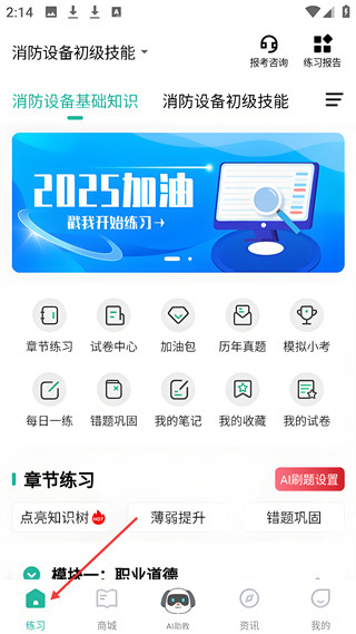 1、練習頁面涵蓋消防設備基礎知識等板塊,有章節練習、歷年真題等豐富功能,助力用戶學習鞏固消防知識。
