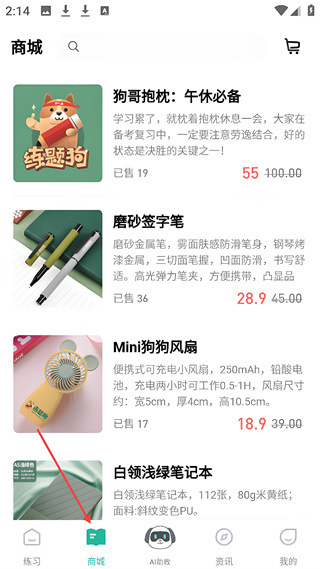 2、商城頁面售賣狗哥抱枕、磨砂簽字筆等商品,兼具實用性與趣味性,能為用戶學習生活提供便利。