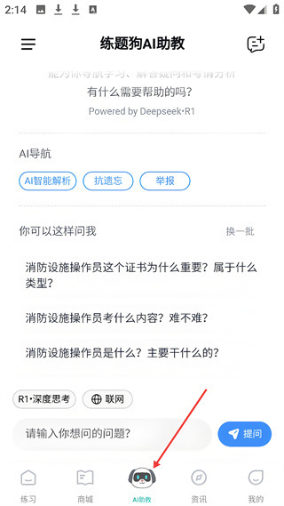 3、練題狗AI助教界面具備智能解析、抗遺忘等功能,可解答消防設施操作員證書重要性等問題輔助學習。