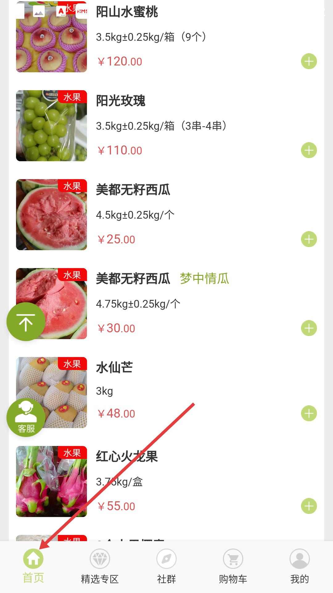 3、操作路徑為首頁往下拉,用戶可以看到界面涵蓋多樣水果,選好商品點首頁可返回初始界面。