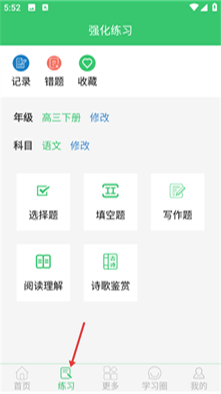 2、進入練習頁面的強化練習板塊,能修改年級與科目,還有選擇題填空題等不同題型選項,可根據學習需求選擇對應題型,進行專項知識練習。