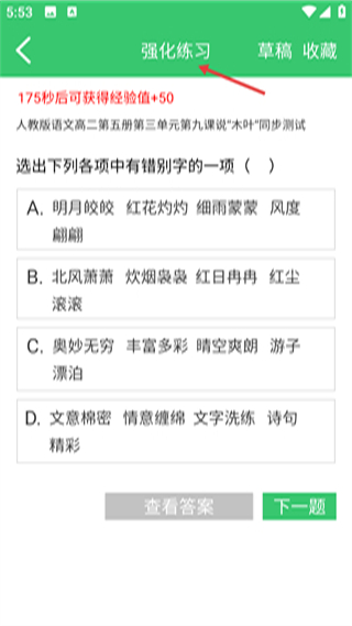 3、進入強化練習的具體答題頁面,能看到題目內容,可使用草稿收藏功能輔助答題,完成當前題目后,可點擊下一題繼續參與答題練習。
