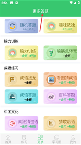 4、進入更多答題頁面,可見隨機答題趣味數獨等答題類型,還有腦力訓練成語練習等板塊,可選擇不同類型或板塊,參與多樣化的答題活動。