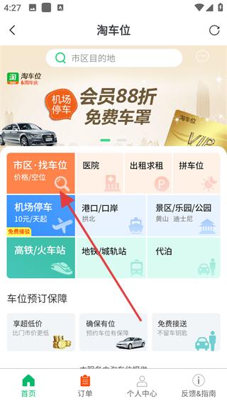 3、進入淘車位頁面選擇市區,找車位板塊,點擊進入臨停比價找車位頁面。