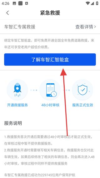 2、若需緊急救援進入緊急救援頁面,點擊了解車智匯智能盒按鈕,可開通救援服務,后續享受全國全年免費道路救援。