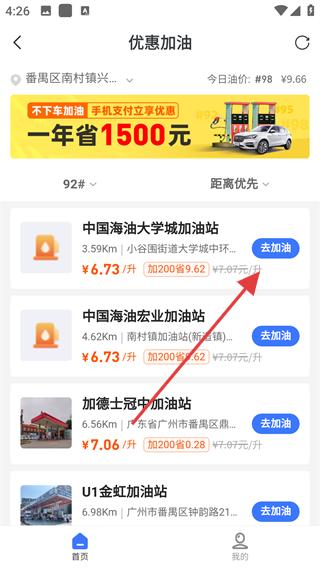1、打開軟件進入優惠加油頁面,看到中國海油大學城加油站等選項,點擊去加油按鈕,可前往該加油站享受優惠加油服務。