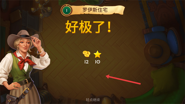 4、完成關卡后,會獲得金幣和星星等獎勵,點擊繼續,可進入下一個關卡繼續游戲。