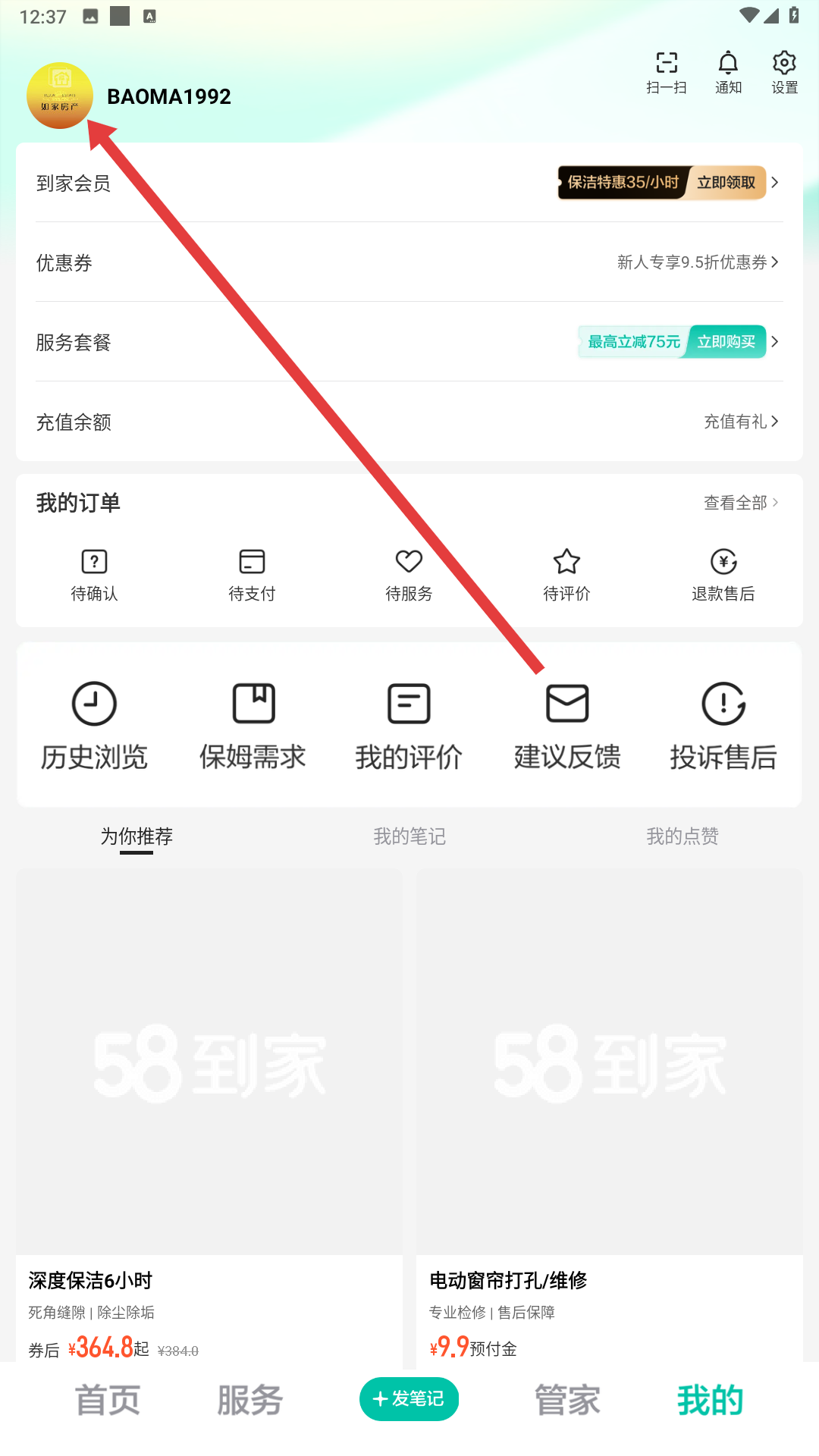 4、進入我的頁面后,點擊個人頭像,可查看到家會員、優惠券、服務套餐、充值余額等信息,也能管理我的訂單、歷史瀏覽、保姆需求等功能。