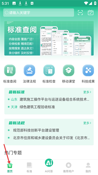 2、首頁界面,有標準查閱、法律法規等功能板塊,展示最新標準法規和熱門專題,滿足建筑領域信息查詢學習需求。