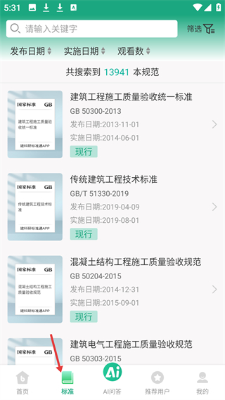 3、標準界面,可搜索建筑規范,展示規范發布實施日期等信息,方便用戶查找具體建筑標準。