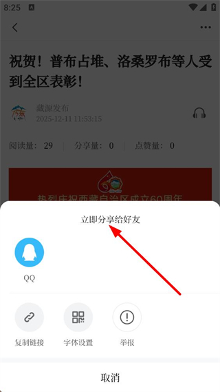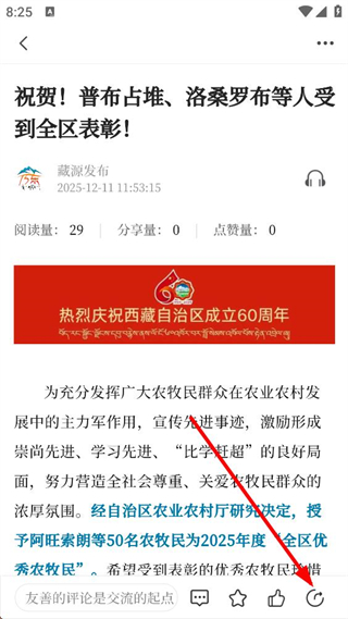 3、進入文章詳情頁面后,找到頁面底部位置的分享按鈕,點擊這個按鈕,彈出包含不同分享渠道的選項菜單。