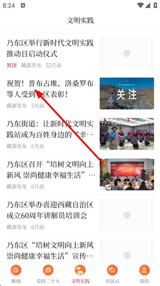 2、進入文明實踐頁面后,找到目標文章條目,點擊該條目,進入這篇文章的詳情頁面,準備進行后續的分享相關操作。