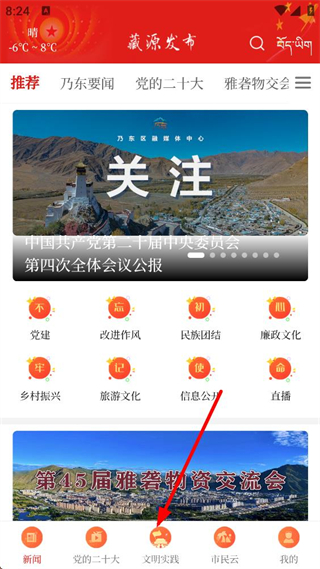1、打開藏源發布主界面,找到底部功能欄里的文明實踐按鈕,點擊該按鈕,進入對應的文明實踐內容頁面,開啟后續操作。