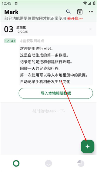 2、注冊后進入旅行日記首頁,點擊下方加號按鈕,準備記錄自己的日常趣事。