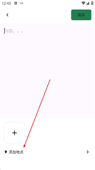 4、在日記編輯頁面,輸入內容信息,點擊加號按鈕可添加相關素材,再點擊添加地點補充位置信息。
