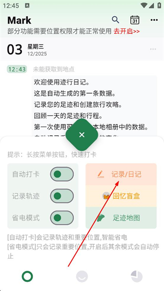 3、點擊下方加號按鈕,打開功能菜單,選擇記錄日記選項進入編輯頁面。