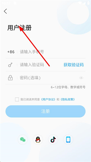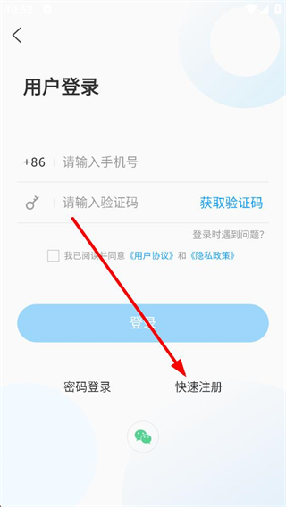 4、選擇快速注冊進入用戶注冊頁面,需輸入手機號、獲取并填寫驗證碼,選填密碼后勾選協議,完成賬號注冊流程以使用更多功能。