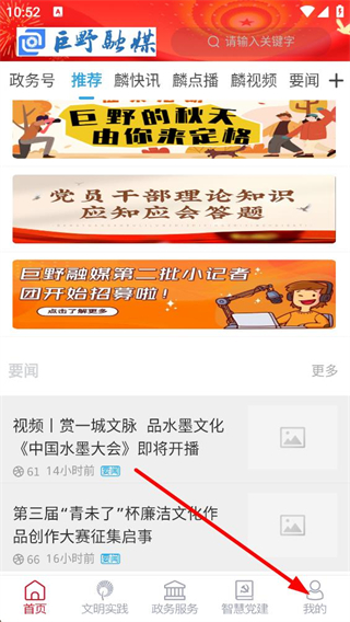 1、進入應用首頁可瀏覽推薦、要聞等板塊內容,包含活動宣傳、理論答題、招募啟事等資訊,底部設首頁、文明實踐等功能入口切換板塊。