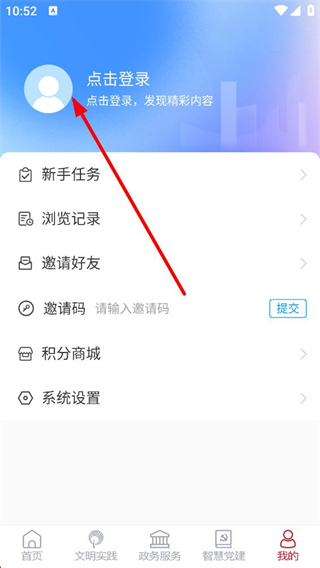 2、點擊底部我的進入個人中心,可看到點擊登錄選項,還能使用新手任務、瀏覽記錄等功能,參與邀請好友、積分商城等互動。