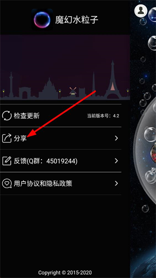 2、進入魔幻水粒子的設置界面,可檢查更新查看當前版本號,使用分享功能傳遞內容,通過反饋入口聯系官方,也能查閱用戶協議和隱私政策了解相關規則。