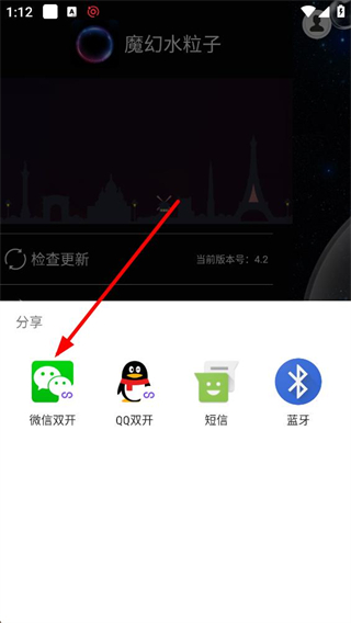 3、設置界面點擊分享后,會彈出包含微信雙開、QQ雙開、短信、藍牙的分享選項界面,選擇對應渠道,即可將魔幻水粒子的內容分享給其他用戶。