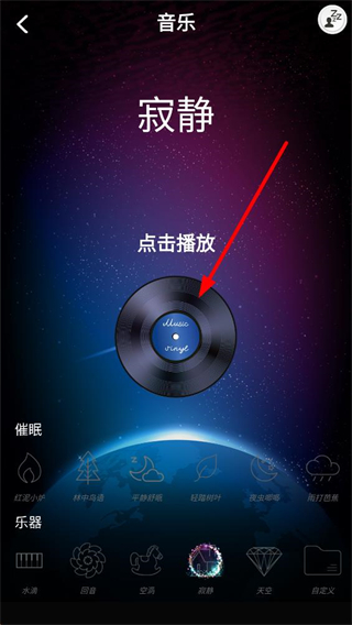 4、進入魔幻水粒子的音樂界面,能看到標注寂靜的播放區域,點擊播放按鈕可開啟音效,還能選擇紅泥小爐、林中鳥語等不同音效,搭配粒子效果提升體驗。