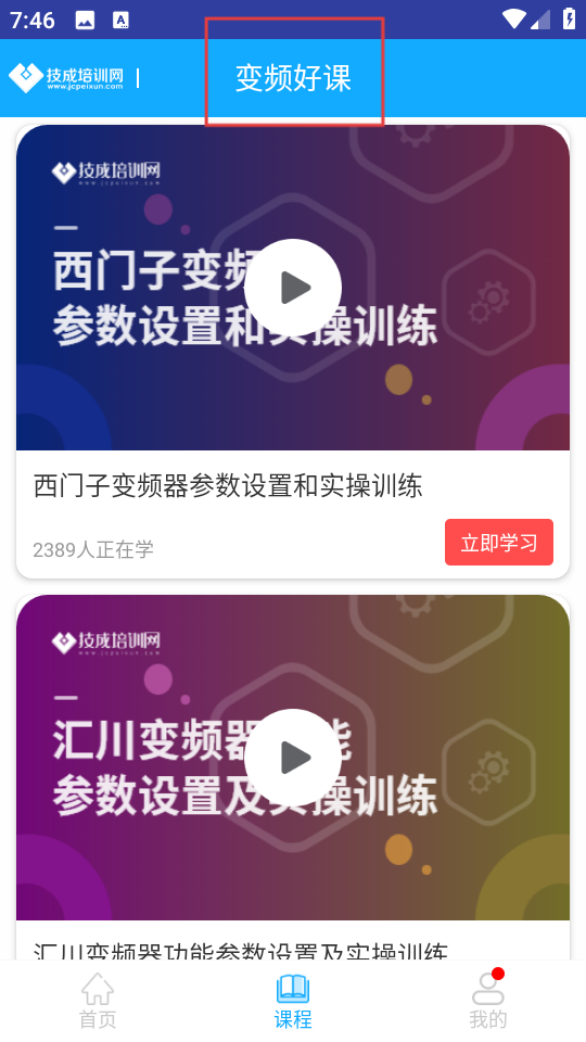 2、點擊底部課程進入變頻好課頁面,這里有西門子、匯川變頻器等實操訓練課,課程配視頻、學習人數及立即學習按鈕,選對應課程借助專業教學掌握實操技能。