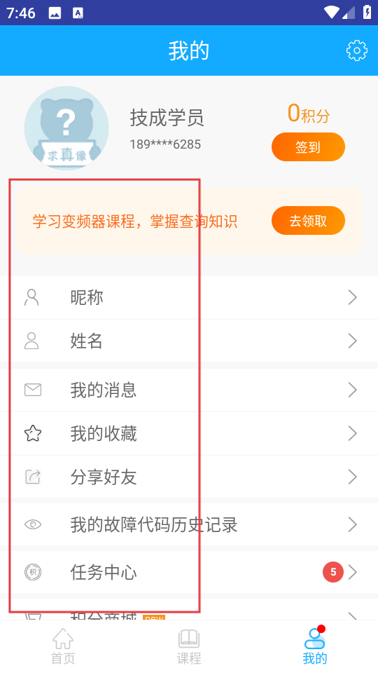 3、切換到我的頁面呈現個人學習相關功能,可查看學習變頻器課程引導,管理昵稱、姓名等信息,查看消息、收藏內容,從個人信息到學習軌跡,全面管理使用過程。
